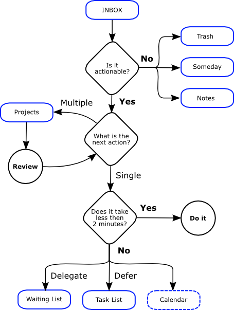 The GTD methodology basically calls for maintaining lists of all loose ends that need be taken care of. The idea is that when all things that need to be done are recorded on a list it will give you peace because you do not have to keep them in your mind all the time. However it is essential that you can access the lists and sort through them so you always know what the next thing is that you can do given the time and tools available at a certain moment.