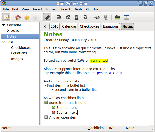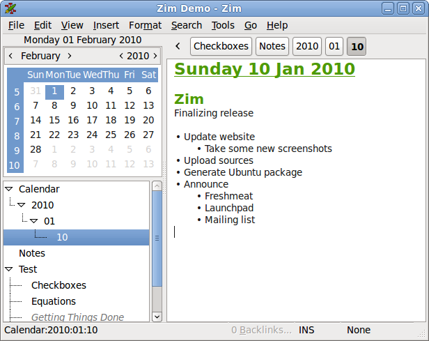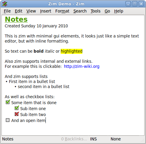 On this page you find some screenshots of zim in action. Of course pictures only capture the look, not how it feels to use, see the screencast for see a bit more of the feeling.